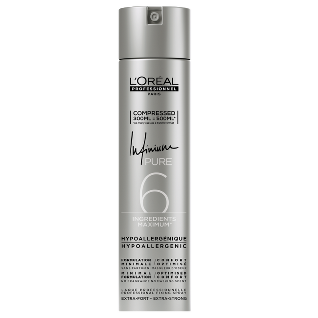 L’Oréal Professionnel Infinium Extra Strong Haarspray is een professionele haarlak met een extra sterke hold. Deze parfumvrije en hypoallergene spray houdt je kapsel de hele dag perfect in model zonder het haar te verzwaren of plakkerig te maken. De ultrafijne mist zorgt voor een gelijkmatige verdeling en een natuurlijke finish met glans, ideaal voor zowel dagelijkse kapsels als glamoureuze looks. De formule van slechts zes ingrediënten is vriendelijk voor een gevoelige hoofdhuid en biedt bescherming tegen vocht voor langdurige perfectie onder alle weersomstandigheden.